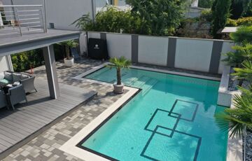 Az 540 m2-es telek, gépjármű és személy forgalom számára szánt felületei térkővel burkoltak. A telek többi részén füvesített terület és többnyire ízlésesen összeválogatott örökzöldek találhatóak. Ezek a növények kevés gondozást igényelnek, így több idő jut a feszített víztükrű, fűthető medence és a mellette található grill terasz élvezetére.