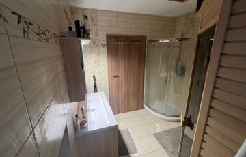 az emeleten három hálószobán kívül egy kádas, zuhanyzós fürdőszoba, valamint egy a fő hálószobából - ahonnan az emeleti teraszra is kijuthatunk - megközelíthető gardrób szoba helyezkedik el.