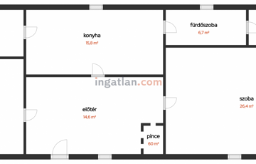 Belépve egy tágas előszobában találjuk magunkat. Innen érhető el mindhárom szoba, illetve a konyha. Szobái óriásiak, a legnagyobb 28 m2, tehát akár még több szoba is kialakítható benne. 3 cserépkályhával oldották meg a fűtést, de gázkazánt is találunk benne. Az ingatlan eredetileg részben körbejárható volt, azonban a konyhát és a szobát összekötő ajtót megszüntették. Bármikor újra nyitható.