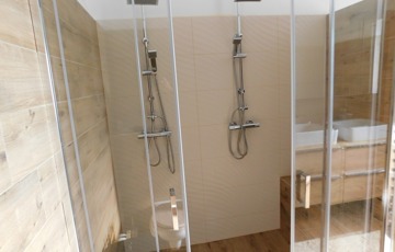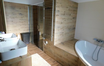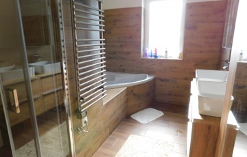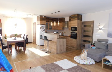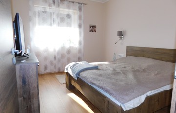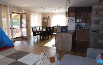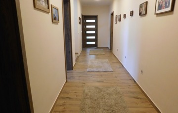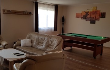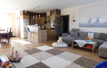 Az egyik lakrész 225m2, melynek földszintjén található 50m2-es teraszkapcsolatos amerikai konyhás étkező-nappali, ahol nagyobb család vagy baráti társaság kényelmesen elfér a terített asztalnál. Továbbá 1 hálószoba hozzá kapcsolódó tágas fürdőszoba sarokkáddal és kétszemélyes zuhanyzóval, külön nyíló 2 szoba, gardrób, fürdő-wc, háztartási helység, tároló, kamra, közlekedő, előtér, lépcsőház. Az emeleten nappali, külön nyíló 2 szoba, fürdőszoba sarokkáddal, gardrób, közlekedő került kialakításra.