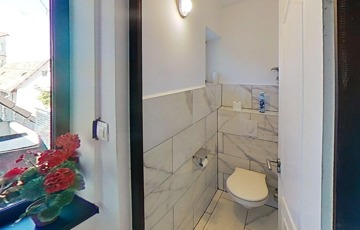 A földszinten további - saját fürdőszobás - hálószoba, utcafronti bejárattal is rendelkező iroda, félszoba, és egy wc/kézmosó is található.