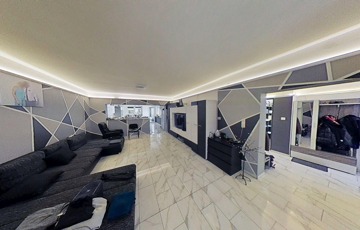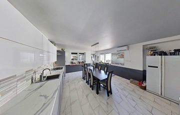 A 374 nm-es ház alsó szintjén a családi élet központja a hatalmas, egy légterű nappali és konyha, mely mégis kellően elszeparált egymástól. A konyhából nyílik a “programtér”, ahol jelenleg kondi, biliárdasztal, jakuzzi, és a bulik kellékei találhatóak. Akár innen is kiléphetünk a teljesen kövezett, zárt udvarra, ahol nagy kutyakennel, wc és melléképületek is találhatóak.