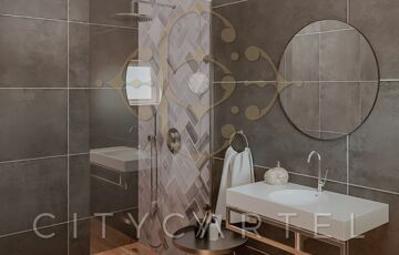 I. osztályú olasz és spanyol hideg- és melegburkolatok 2 cm vastag design kőburkolat a teraszokon Exkluzív spanyol-olasz kerámiapadló a fürdőszobákban Fujitsu Waterstage High Power rendszer – energiatakarékos melegvíz ellátás GROHE prémium csaptelepek és zuhanyzók