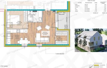 A lakás alapterülete 55,61 m2, egy tágas szobával, hatalmas amerikai konyhás nappalival és erkéllyel is rendelkezik.