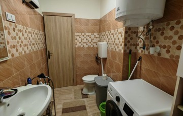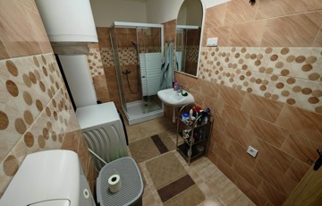 - A fürdőszobában modern burkolatok és szaniterek lettek beépítve