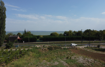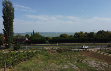 A Balaton víztükre már a telek alsó részén is látható, de a majdani épület felső szintjéről zavartalan panoráma nyílik majd, amelyet hamarosan drónfotókkal láttatunk a hirdetésben.