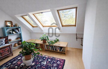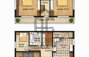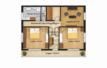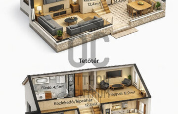 - Tetőtéri szobákhoz erkélykapcsolat, valamint egy 14,8 m²-es loggia is tartozik