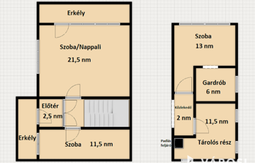 A ház szint eltolással épült, 2 emeletes. A ház földszinti részén egy tágas, világos nappali található, egy kisebb társalgó és egy 3 éve készült fürdőszoba. Azt ezt követő szinten egy étkező, egy konyha, egy kamra, egy nagy fürdő és egy külön WC található. Innen a ház emeleti részére érve 2 szoba lett kialakítva, mindegyik szobához tartozik egy erkély is. Azt ezt követő szinten pedig egy szoba + gardrób és egy jelenleg be nem épített, csak tárolásra használt helyiség van.