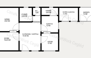 <p>A ház praktikus elosztású: egy tágas, 16,56 m²-es előszobából nyílik a 15,38 m²-es első szoba, valamint a nagyobb, 23,5 m²-es második szoba. A konyha 13 m² alapterületű, mellette egy 3,65 m²-es kamra található. A harmadik szoba 12 m²-es, a fürdőszoba 4,45 m², a WC külön helyiségben kapott helyet (1 m²), továbbá egy 1,14 m²-es közlekedő is megtalálható a belső térben.</p>