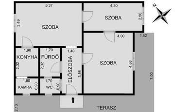 Nappali, 2 szoba, konyha, előszoba, fürdőszoba és terasz áll rendelkezésre jelenleg. Teljeskörű műszaki és esztétikai felújítás szükséges.