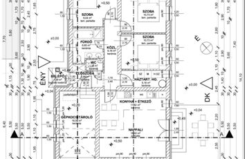 3 hálószobával, fürdőszoba + WC, külön WC, közlekedő, előszoba, háztartási helyiséggel rendelkezik.