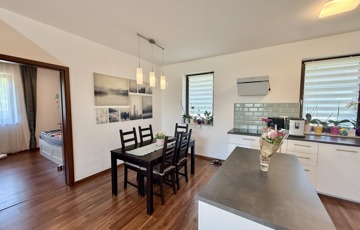 Eladásra kínálunk egy 2021-ben épült, szinte új ikerházat, amelynél a szomszédokkal csak a garázsnál érnek össze a falak – így valódi családi ház érzetet nyújt.