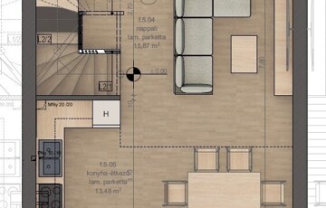 Fűtése 9,5 KW-os hőszivattyúkról ,padlófűtés, használati meleg víz és lakásonként 2db beltéri klíma egységek is erről üzemelnek.