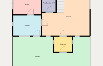 Az ingatlan praktikus elrendezésű: a földszinten egy világos nappali, egy külön nyíló szoba, tágas konyha és fürdőszoba található. Az emeleten egy nagy légterű szoba kapott helyet, amely hálószobaként, dolgozószobaként vagy akár hobbitérként is használható. A nagy ablakfelületeknek köszönhetően a ház minden helyisége napfényben gazdag, barátságos hangulatú. Az épülethez kapcsolódik egy közel 50 m²-es, részben fedett terasz, amely tökéletes családi és baráti összejövetelekhez.