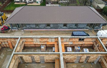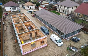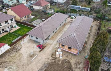 Vasbeton sávalapon 30 cm-es Porotherm falazat nyugszik, fa födémmel, cserép héjalással, alul 12 cm, oldalt 15 cm, míg a födémen 30 cm-es fújt cellulóz szigeteléssel. A lakások között az elválasztó falak duplán vannak rakva (nincs áthallás), a kertrészek között és a padlástérben is biztosított a szeparáltság. Fontos kiemelni, hogy a lakásokba nem kerül bevezetésre a gáz. A fűtést, a hűtést és a használati meleg vizet Daikin hőszivattyú biztosítja 260L-es melegvíz tárolóval, az A+-os energetikai besorolást hővisszanyerős szellőztetőrendszer(!) biztosítja. A hőleadás helyiségenként szabályozható padlófűtéssel, illetve mennyezeti hűtés/fűtéssel történik. A szobákból így nem foglalnak helyet a radiátorok, nincs szükség klímára sem. A hőszivattyú működését napelemmel lehet segíteni, de ezek nem kerülnek felszerelésre, csupán előkészítésük lesz biztosítva az inverterig. A nyílászárók barna színű, 5 kamrás műanyag ablakok, 3 rétegű üvegezéssel. Hőhídmentes rejtett redőnytokok készülnek melyek elektromos alumínium redőnyt kapnak. A riasztó előkészítését az ár tartalmazza, de a rendszerét és a telepítését nem. Minden lakáshoz 1 db felszíni gépkocsi beálló tartozik, melyet motoros kapun keresztül lehet megközelíteni. A projekt, számos környékbeli referenciával rendelkező beruházó által lesz megvalósítva. A beruházó tőkeerős, nem a vevők pénzéből építi fel az ikerházat.Az építkezés elkezdődott és a tervezett ütemben halad.