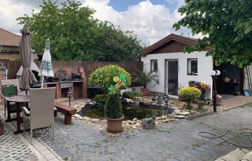 • Hangulatos hátsó kert halas tóval és sütögetőhellyel
