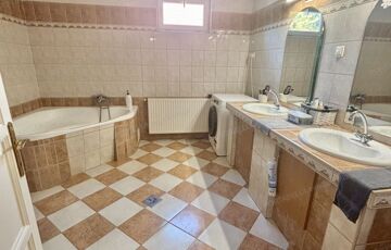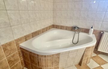 Großes Badezimmer mit Eckbadewanne und Dusche
