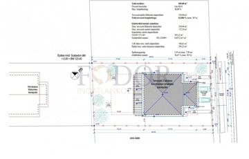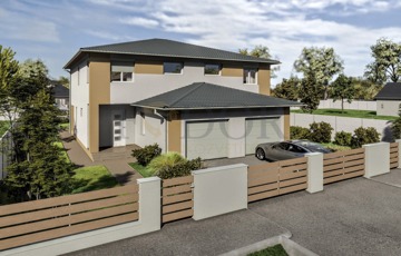 A 849 m²-es telken épülő ingatlan mindkét fele saját, 424 m²-es leválasztott telekrésszel rendelkezik, valamint egy viacolorral burkolt kocsibeállóval is ellátott.