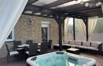 beépítésre. 2019-ben 32 kw-os zárt égésterű kombi gázcirkó cseréje megtörtént alsó szinten padlófűtés, emelti szinten radiátoros fűtés üzemel. 2024-ben 5 KW-os, szaldós rendszerben elszámolt napelemes rendszer került felszerelésre. Az épület számos extrával felszerelt, riasztó és kamerarendszer, 35 nm-es polikarbonáttal fedett és wpc-vel burkolt terasz jacuzzival, kerti halastó, elektromos árnyékoló, automata öntözőrendszer, elektromos motorizált nagykapu, ledvilágítás. Az ingatlan osztatlan közös
