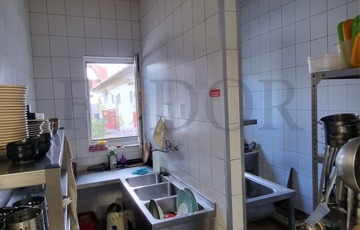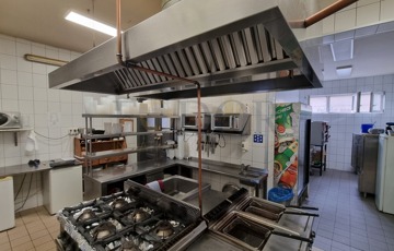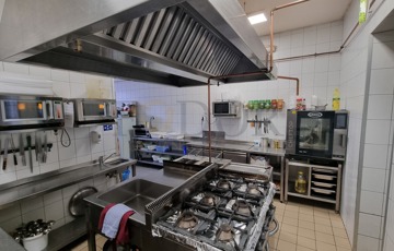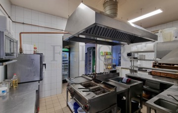 A konyha modern és professzionálisan felszerelt: rozsdamentes munkafelületek, hatékony elszívó rendszer, ipari mikrók, kombipároló, pizza sütő, hűtők és további eszközök biztosítják a gördülékeny működést. Az ingatlan tartalmaz továbbá konyhai előkészítőket, raktárakat, személyzeti öltözőt, irodát és mellékhelyiségeket is.