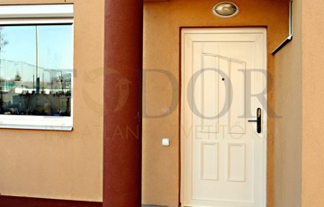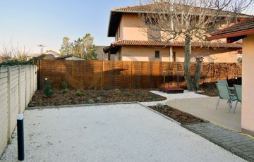 A ház egy zárt, közös udvarral rendelkező társasház része, saját, nem utcafronti bejárattal, elektromos kovácsoltvas kapuval védve.