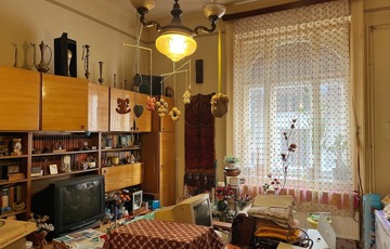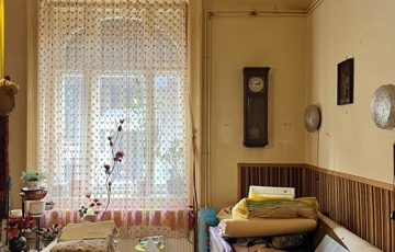 A lakás teljes körű felújítást igényel, az elosztása rendkívül praktikus: két bejárattal rendelkezik, az egyik a konyha melletti galériázott cselédszobából nyílik. A bejáratból tágas előtérbe lépünk, ahonnan az étkező és beépített, falig érő szekrénysor fogad. Innen egyenesen a nagyobbik szobába jutunk, majd egy átjárón keresztül elérjük a másik szobát is, ahonnan visszakanyarodhatunk az étkezőbe.