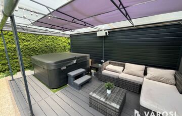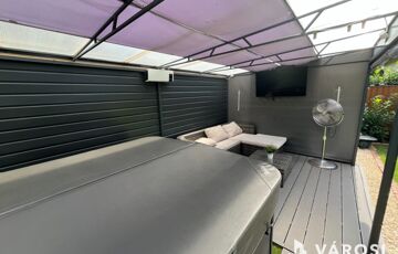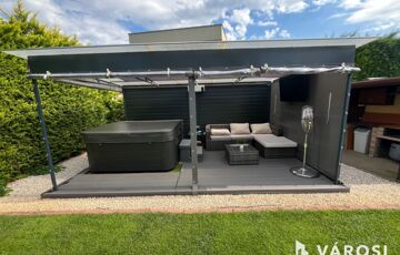 - **Kényelmi szolgáltatások**: Teljes komfortot nyújt a jakuzzi, elektromos garázskapu, redőnyözött ablakok, dekorvilágítás, valamint a beépített szekrények és gardrób.
