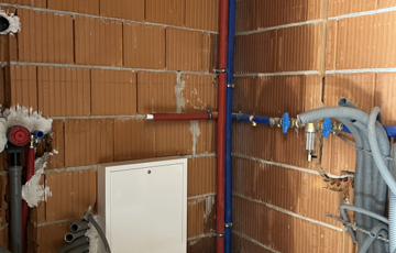 Fűtése 9,5 KW-os hőszivattyúkról ,padlófűtés, használati meleg víz és lakásonként 2db beltéri klíma egységek is erről üzemelnek.