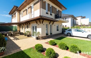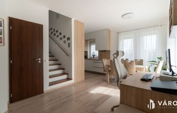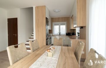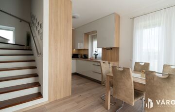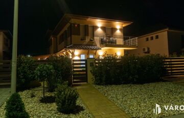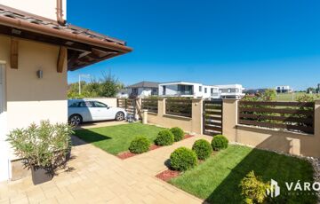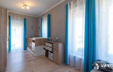 Eladó Siófok Sóstó városrészén egy 2020-ban épült ikerház utcafronti része. Az épület kiváló állapotban van. Precízen átgondolt, rendkívül praktikusan megtervezett bruttó 115 m²-es házról van szó, melyhez 30 m² térkövezett terasz (melyből 20 m² fedett), egy nagy 7m²-es erkély, valamint udvaron belüli térkövezett gépjárműbeálló tartozik. Az ingatlan külön helyrajzi számon van saját telekhányaddal, mely 174 m². Összesen 86 m² nettó lakótérről beszélhetünk. A földszinten található az amerikai konyhás nappali, egy szoba, egy fürdőszoba és egy külön WC. Az emelet 2 szobával, egy nagy fürdőszobával, gépészeti helyiséggel, közlekedővel, valamint egy tágas 7 m²-es erkéllyel rendelkezik.