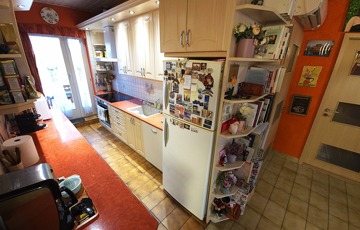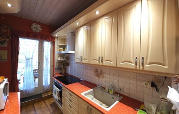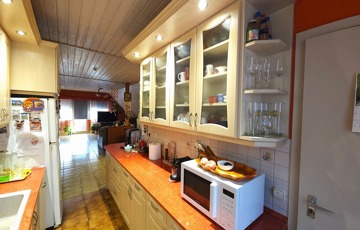 - az emeleti konyha 3 éve lett prémium minőségű – AEG – gépesítéssel felszerelve sütő, indukciós főzőlap, Falmec külső motoros (padláson van a motor) páraelszívó, + kamráva.