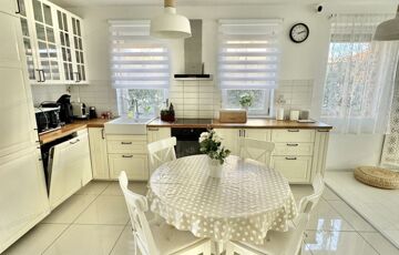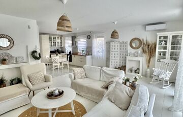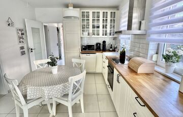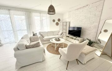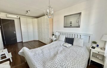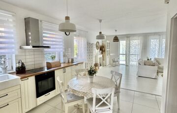 A sok méretes ablaknak köszönhetően NAGYON VILÁGOS a nappali. A konyha felszereltsége: beépített sütő -és főzőlap, beépített hűtő -és mosogatógép. A beépített konyhabútor és a hozzá tartozó teljes felszereltség a vételár részét képezik, ahogy az összes bútor is.