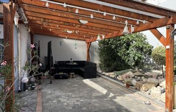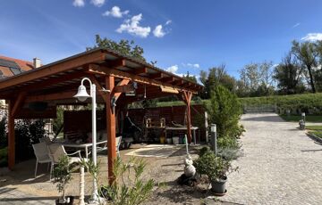 Az udvaron helyett kapott egy fa szerkezetű, fedett pergola, mely a mindennapok és a társas összejövetelek kényelmét szolgála.