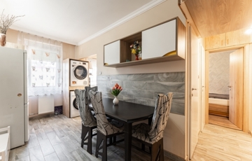 A lakás három égtáj felé néz, így egész nap természetes fényben úszik. A környék csendes, mégis kiváló infrastruktúrával rendelkezik – iskola, óvoda, boltok, buszmegállók pár perc sétára.