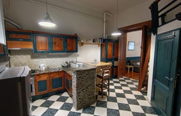 A konyha teljesen felszerelt, a munkapult márvánnyal borított, amely egy szintén márványborítású bárpulttal is ki van egészítve.