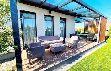 Terasz: 33 m²-es fedett terasz hővédő polikarbonát borítással, alumínium szerkezettel, rejtett esővíz-elvezetéssel és alu lamellákkal – tökéletes helyszíne családi ebédeknek, baráti összejöveteleknek vagy esti pihenésnek