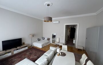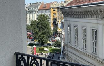 A Gross palotában, 2023-ban felújított, nagy erkéllyel rendelkező, 3. emeleti, napfényes, egyszobás lakás.
