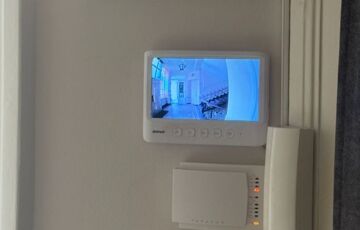 A kétszárnyú bejárati ajtó közvetlenül a lépcsőházból nyílik, ahogy felérünk a lifttel.
