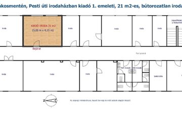 Az iroda egyetlen helyiségből áll, elhelyezkedése az alaprajz szerinti, bútorozatlanul kerül kiadásra.