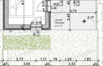 A meghirdetett földszinten található 48,72 nm-es lakásban amerikai konyhás nappali, szoba, fürdőszoba és előtér található. Nappaliból 9,21 nm-es terasz és 87,65 nm-es kertkapcsolat nyílik.