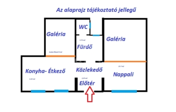 A LAKÁS RÉSZEI: nappali - galéria, egy szoba - galéria egyben, konyha, étkező, fürdőszoba- WC külön helységben található.