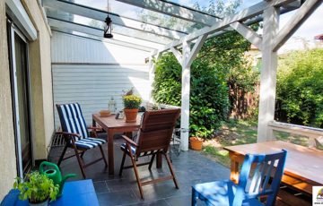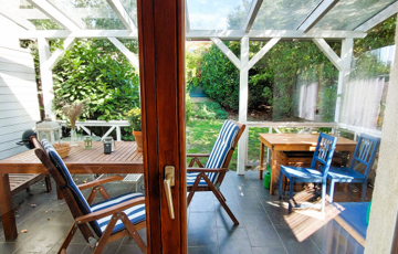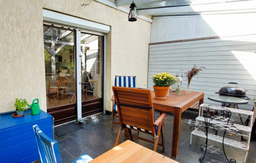 -Modern, amerikai konyhás nappali fedett terasz- és kertkapcsolattal