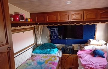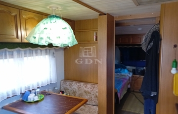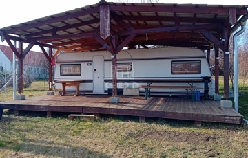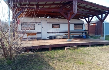 - 50 m²-es fatetőszerkezet, lemeztetővel, alatta 20 m²-es lakókocsi (5 férőhelyes) hangulatos fabútorokkal, kis konyhával