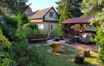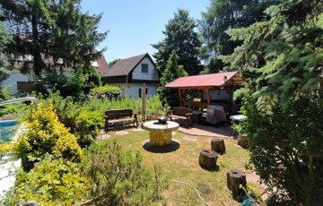 In a quiet residential part of Budatétény, a truly exceptional property is for sale on a 1655 m² double plot with two separate houses. The landscaped garden with a private pond, wooden bridge and swimming pool is a rare highlight. The main house offers 240 m², the guest house 34 m², both with multiple usage possibilities.