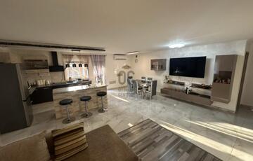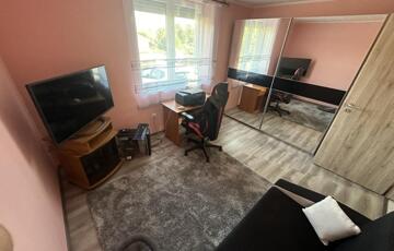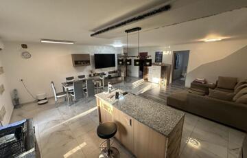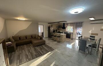 A burkolatok és a helyiségek elosztása a mai, modern igényeknek megfelelő, ezt az érzetet tovább fokozza az amerikai konyhás nappali.