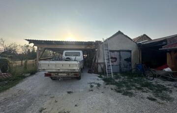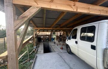 Az épület mellett található egy garázs, egy fedett beálló, amely 2 gépkocsi számára biztosít helyet.