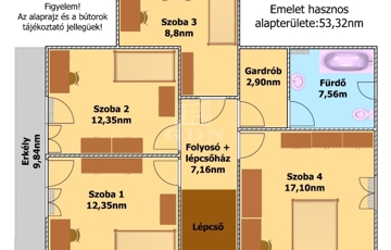 Az épület hasznos alapterülete 65,33+53,32= 118,65nm, melyben található: