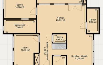 A 24 nm-es nappalin kívül a lakásban 3 hasonló méretű (14 nm) hálószoba található, illetve igény szerint a felső alaprajznál feltüntetett dolgozószobát át lehet alakítani egy teljes értékű 19 nm-es hálószobává. A nappalit, az előteret és a konyha/ étkezőt, középen a szinteket összekötő lépcső osztja meg, melynek aljába egy 2 nm-es kamra is kialakításra került. Az ingatlanban két fürdőszoba található.