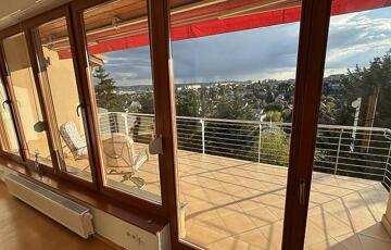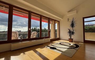 A nappaliból nyílik egy 15 nm-es délnyugati fekvésű, gyönyörű panorámával rendelkező, félig fedett, motoros árnyékolóval ellátott terasz, illetve szintúgy a nappaliból közelíthetjük meg az oldalsó, nyugati fekvésű 5 nm-es, teljesen fedett erkélyt.