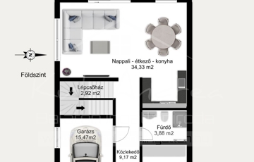 Földszint: 1 amerikai konyhás étkezős nappali, 1 (dolgozó) szoba, 1 tusolós fürdő toalettel, 1 közlekedő, 1 garázs, lépcsőház