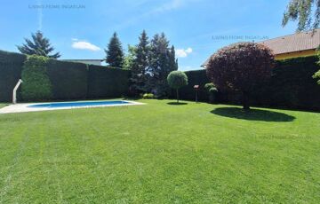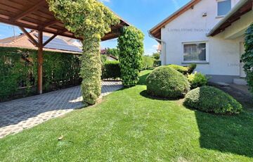 <p>A kertje kertész által gondozott, parkosított, füvesített (automata öntözőrendszer, mely saját kútról működik), örökzöldek, fák, rózsák teszik csodálatossá. A kerítések mentén a magasra nőtt, szépen nyírt sövények biztosítják a szomszédoktól és az utcáról a lakók számára a teljes intimitást. A kert egyik sarkában egy mesterséges nagyméretű csobogó-vízesés látványát és hangját élvezhetjük. A kerti medence mérete 8x4 m és 1,5 m mély, mely fűthető is.</p>